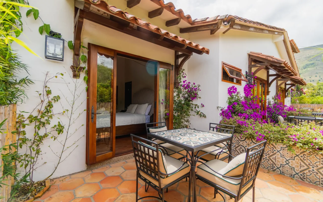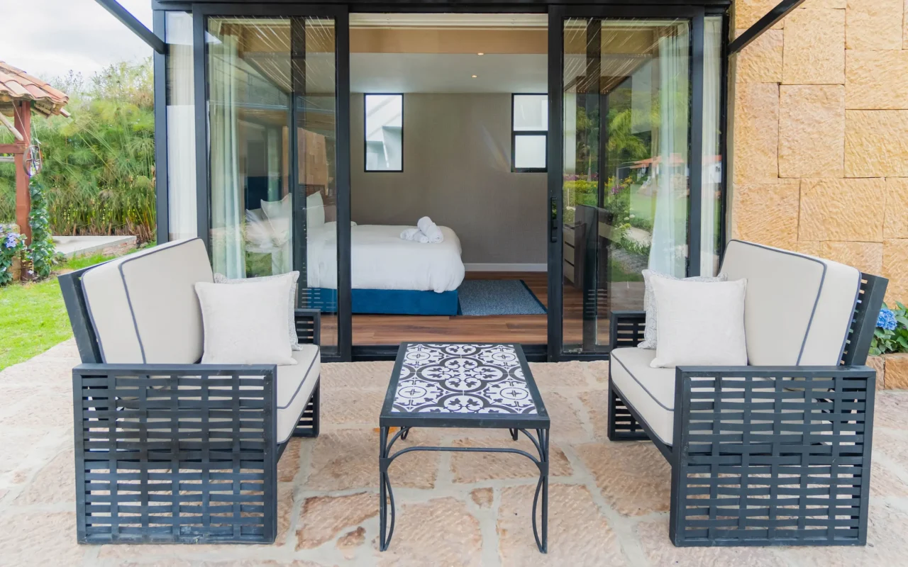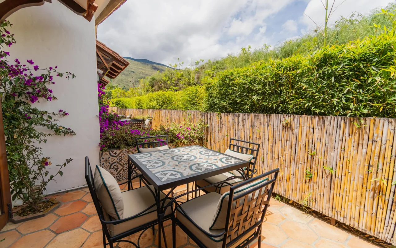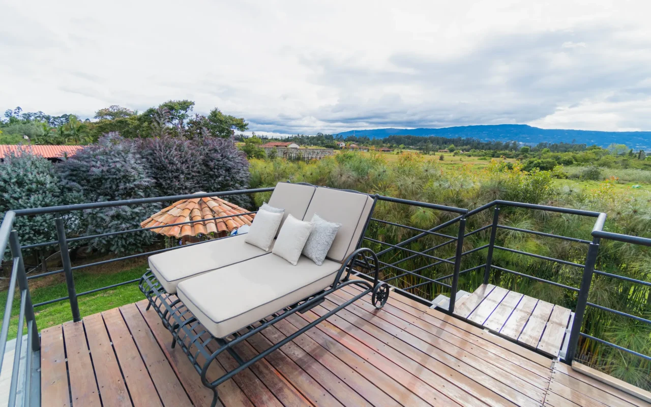 Habitación con amplia terraza superior privada y sala exterior, diseñada para disfrutar del confort y la serenidad con las mejores vistas a los jardines y a la montaña.