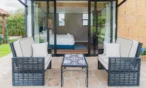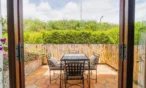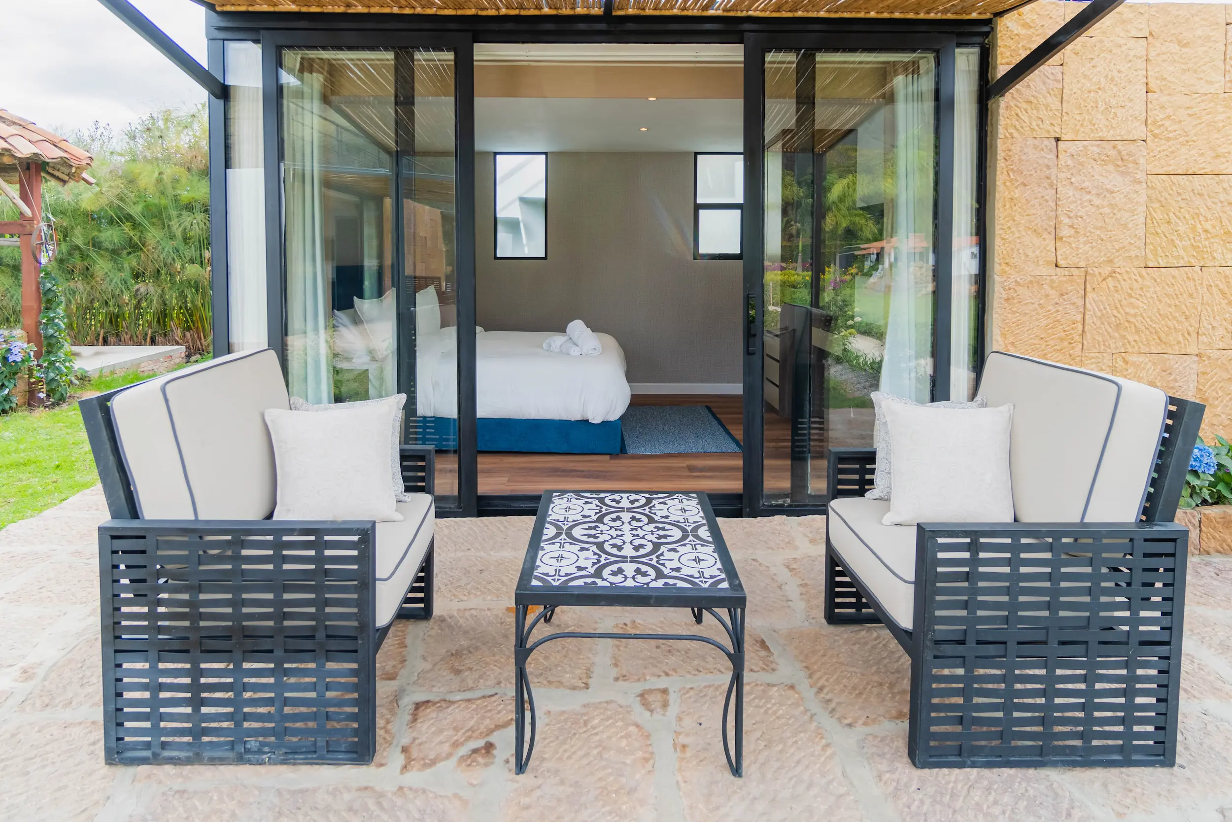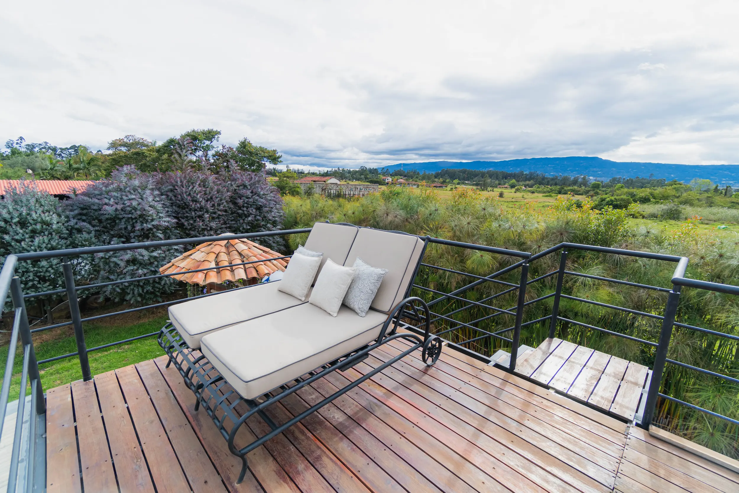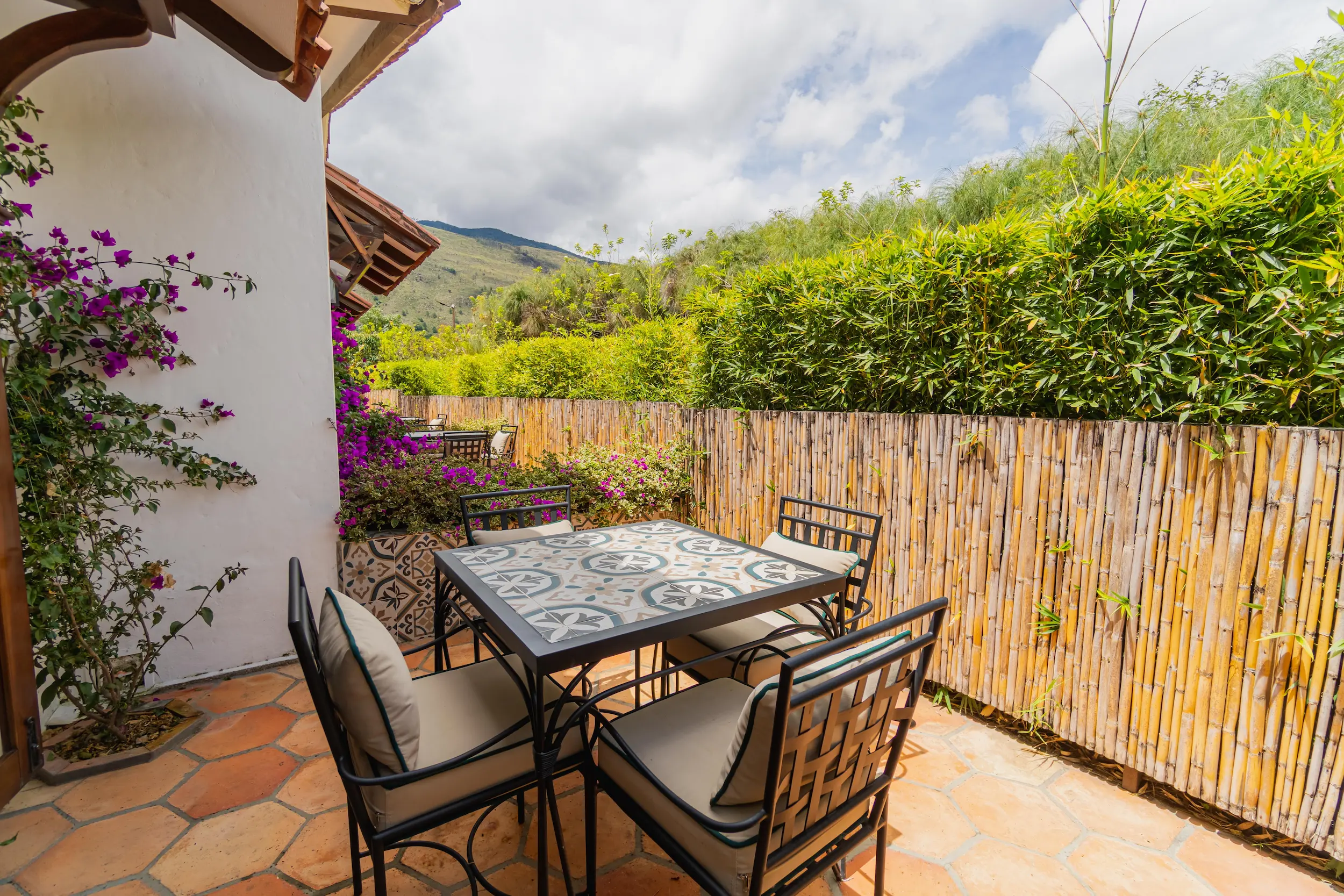 Habitación con amplia terraza superior privada y sala exterior, diseñada para disfrutar del confort y la serenidad con las mejores vistas a los jardines y a la montaña.